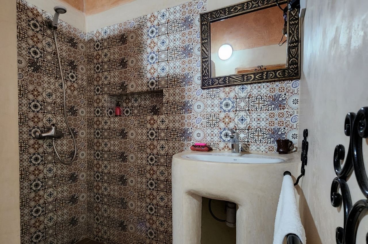 Tafoukt, which means “sun” in Amazigh, embodies warmth and radiance. This spacious deluxe studio combines Moroccan elegance with modern comfort. Natural light fills the room through large openings, creating a bright and welcoming atmosphere.